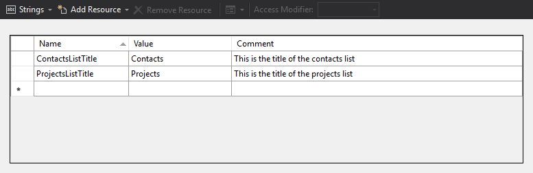 - Create a new RESX file in Visual Studio (or, if you insist, create one from scratch in Notepad and write the XML manually). Enter your values: